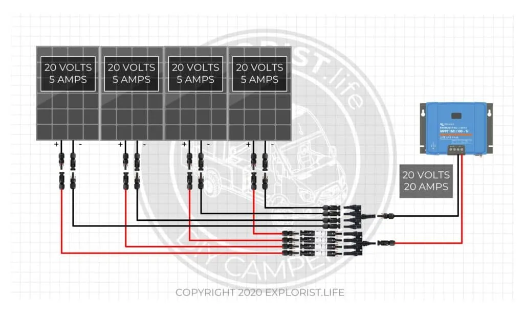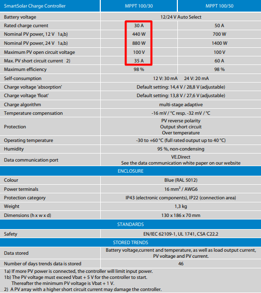 Jätame oletuse samaks et soovime paigaldada kolm Victroni 175W paneeli. Paraleeli ühendades tõuseb pinge (V-voldid) asemel voolutugevus (A-amprid). Seega meie ahela puhul on maksimaalne pinge 19,4V ja voolutugevus 9,89A x 3 = 29,67A. Otsides Victroni valikust kontrollerit näeme, et esimene mille “Maximum PV open circuit voltage” oleks üle 19,4V ja “Max. PV short circuit current” oleks üle 29,67A on taaskord Smartsolar MPPT 100/30 (näitajad vastavalt 100V ja 35A). Kuigi laadimisvõimsus 12V juures on taaskord veidi madalam kui meie päikesepaneelide ahela võimsus (440W vs 525W), siis selline 20% vahe on igati okei. Tõenäosus, et paneelidest üldse 100% kätte saab on suhteliselt madal, eriti Põhja-Euroopas. Kui on aga soov, et saaks kindlalt ka perfektsetes oludes maksimumi kätte siis tasub vaadata suuruselt järgmist kontrollerit, milleks on Smartsolar MPPT 100/50, mille laadimisvõimsus on juba 700W.