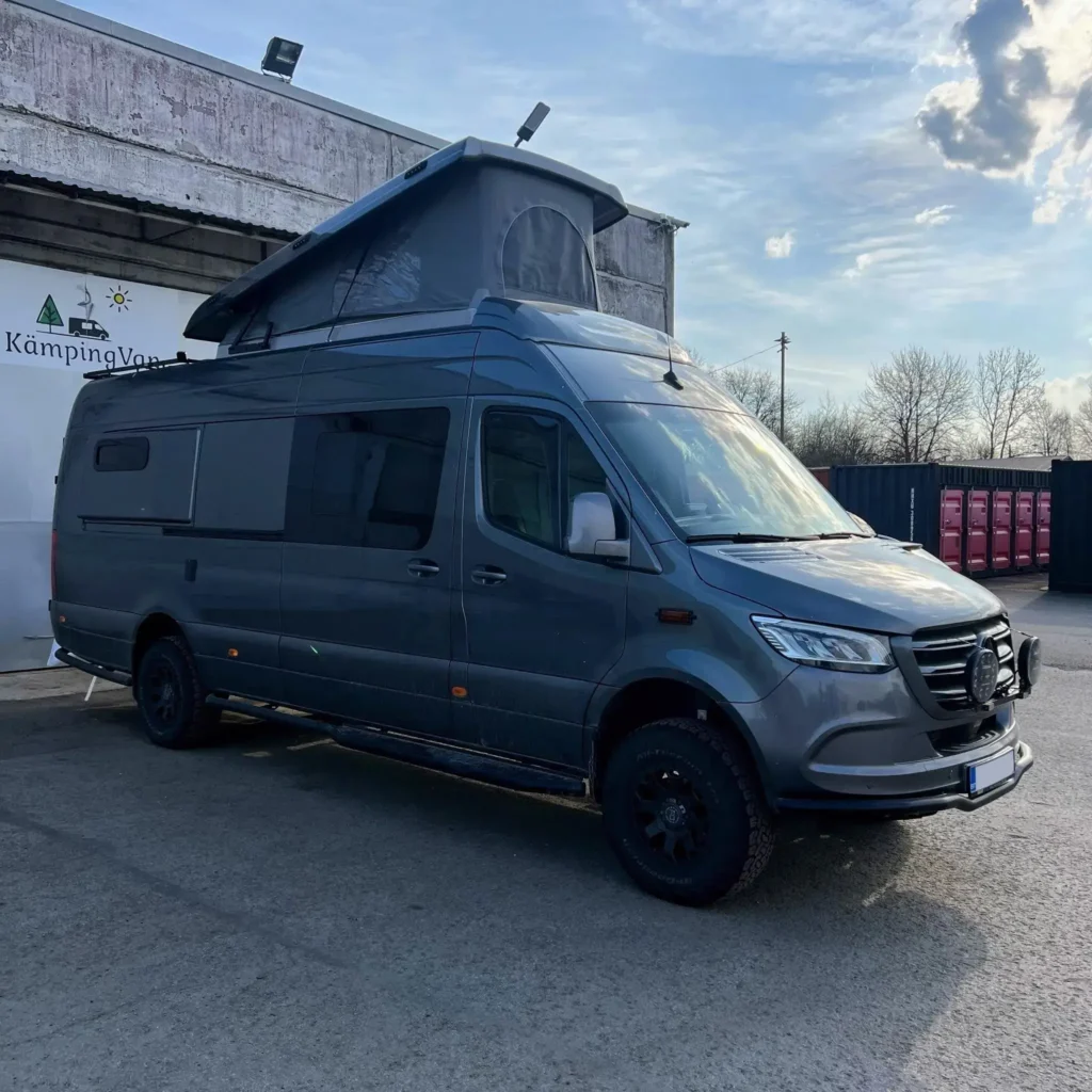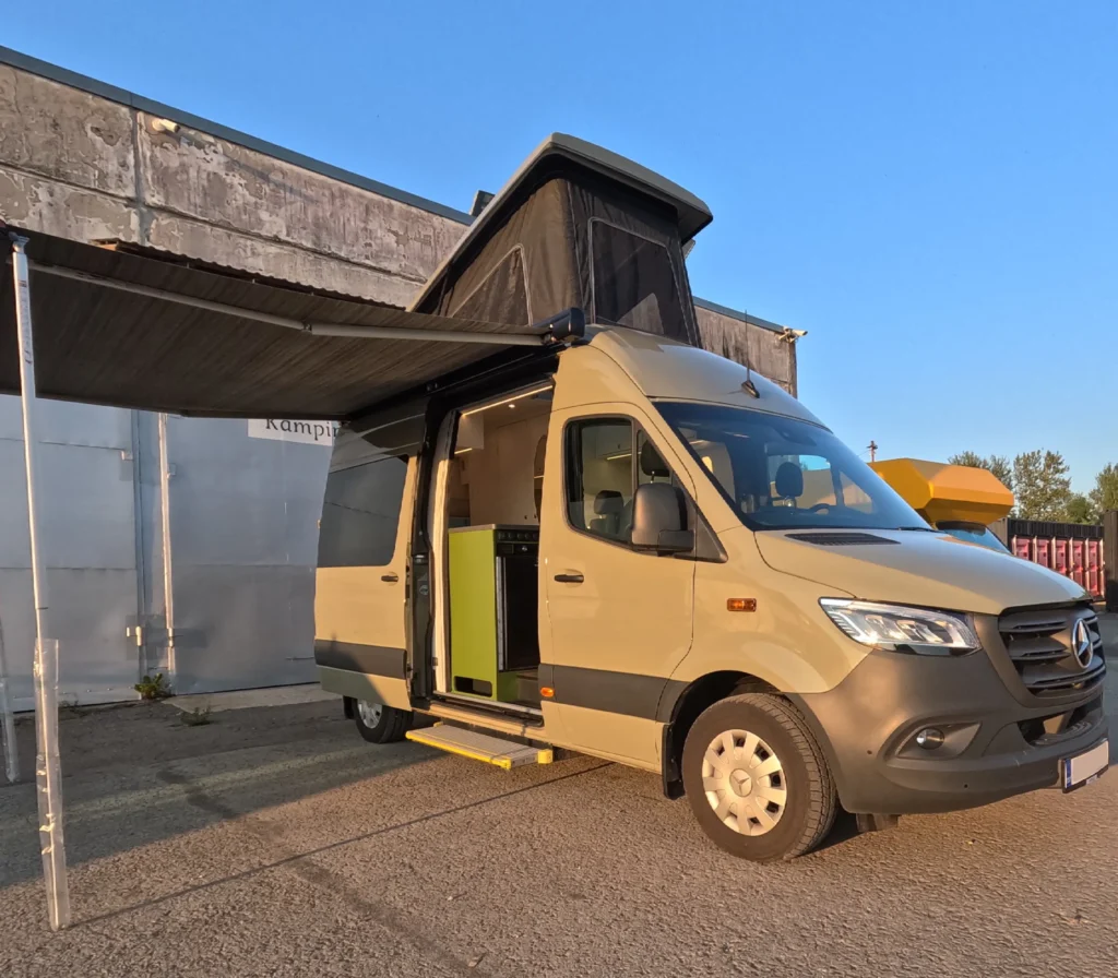Kuuekohaline KämpingVan varustatud väljatõmmatava köögi, suure narivoodi, päiksepaneeli ja kliimaseadmega.